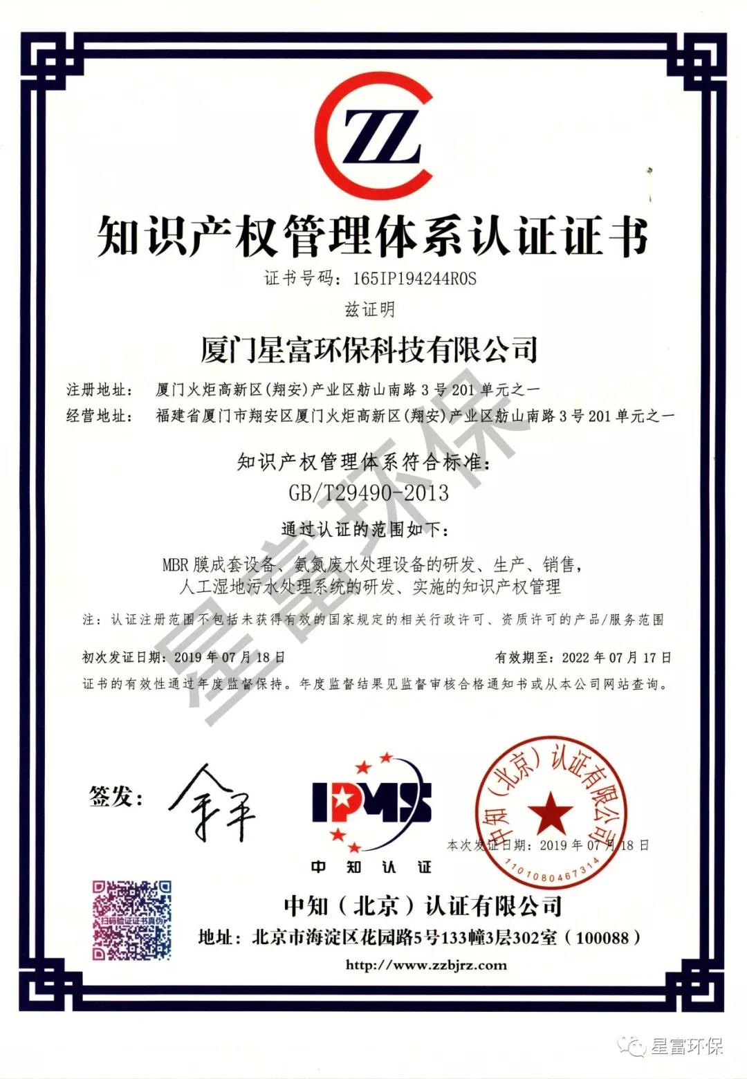 2019年07月18日,收到由中知(北京)認(rèn)證有限公司頒發(fā)的《知識(shí)產(chǎn)權(quán)管理體系認(rèn)證證書》,這意味著星富環(huán)保在知識(shí)產(chǎn)權(quán)領(lǐng)域獲得到重要認(rèn)可,在知識(shí)產(chǎn)權(quán)方面得到進(jìn)一步規(guī)范和在綜合競(jìng)爭(zhēng)力得到進(jìn)一步提升。